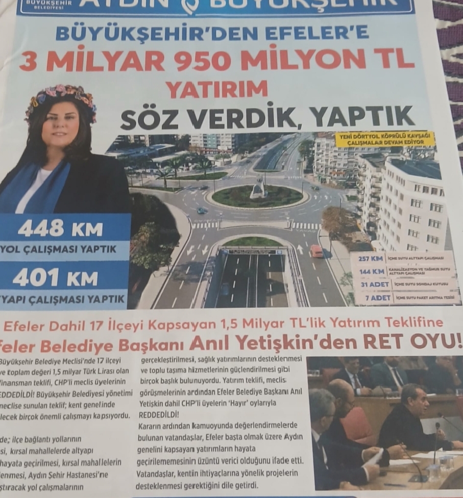 “Aydın Büyükşehir Belediye Meclisinde 17 ilçeyi kapsayan 1,5 Milyar TL’lik yatırım ve finansman teklifi Efeler Belediye Başkanı Anıl Yetişkin dahil CHP’li Meclis üyelerin “Hayır” oylarıyla reddedildi.”
