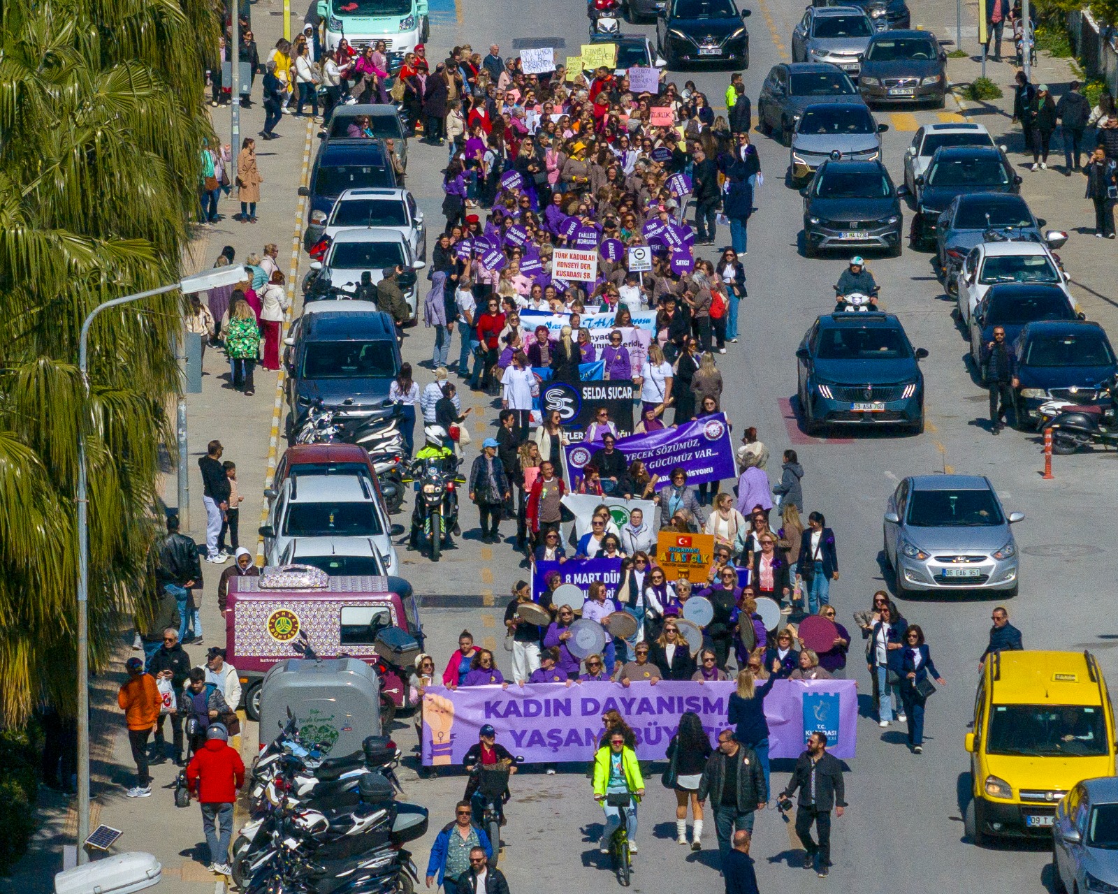 Kuşadası’nda 8 Mart Dünya Kadınlar Günü coşkuyla kutlandı. Kutlamalar kapsamında, Kuşadası Belediyesi Kadınca oluşumu tarafından Kısmet Otel Kavşağı’ndan başlayan kortej düzenlendi. İsmail Cem Dostluk ve Barış Meydanı’nda sona eren korteje, Kuşadası Belediye Başkan Yardımcısı Ayşegül Dağlı, Kuşadası Belediyesi Kadınca Oluşumu Onursal Başkanı Duygu Günel, Kuşadası Belediyesi Meclis üyeleri, sivil toplum kuruluşları ve çok sayıda kadın derneği katıldı.