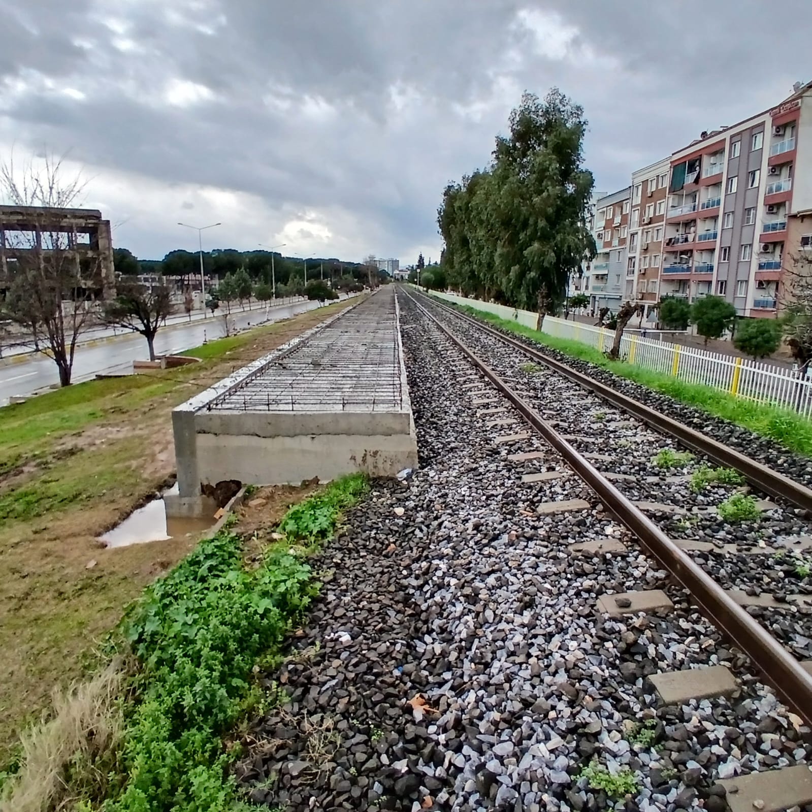 Tek hat tren yolu kenarına beton dökülmüş. Yarın bir gün üstüne demir korkuluklar.